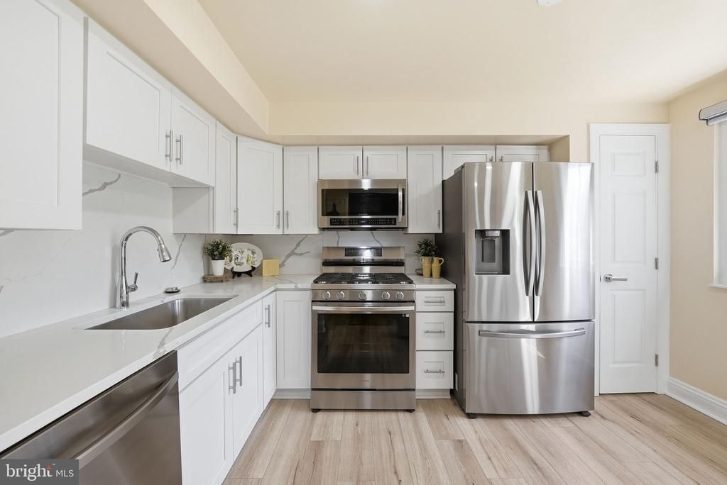 Welcome to this beautifully updated interior townhome offering 3 bedrooms and 3.5 bathrooms, thoughtfully designed with modern finishes and exceptional attention to detail. The heart of the home is the stunning, fully renovated kitchen featuring rich navy blue cabinetry, luxurious Calacatta quartz countertops, and a full-height backsplash, along with Samsung stainless steel appliances including a French door refrigerator, gas range with built-in air fryer and convection oven, ultra-quiet three-rack dishwasher, and over-the-range microwave. A spacious island bar, large single-basin undermount sink, and soft-close cabinetry make it perfect for everyday living and entertaining. Throughout the home, enjoy the convenience of Levelor rechargeable remote-control blinds, adding both comfort and modern efficiency. Upstairs, the expansive primary suite offers a walk-in closet and a beautifully updated en-suite bathroom, while all bathrooms have been tastefully renovated with high-end vanities (many topped with marble), updated tile, modern toilets, upgraded faucets, exhaust fans, and stylish hardware. The fully finished walk-out basement provides incredible additional living space, complete with a cozy wood-burning brick fireplace, a full luxury bathroom, and a sleek bar area featuring a marble countertop, soft-close cabinetry, and a single-basin sink—ideal for entertaining or guest space. Ample storage is available with multiple closet areas, including under-stair storage and a dedicated utility room. Step outside to enjoy the brand-new Trex deck, perfect for relaxing or hosting, along with a private setting and a welcoming community known for its great neighbors. Additional recent upgrades include a new security front door and storm/screen doors (August 2025), a new sump pump (June 2025), ProVia double-hung vinyl windows, a 50-year architectural shingle roof, Carrier HVAC system, and water heater. Ideally located near Fort Belvoir, the Pentagon, Kingstowne shopping, dining, and major commuter routes, this home offers the perfect balance of comfort, style, and convenience in a highly desirable location.